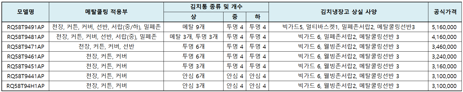 마지막 2가지 모델 RQ58T9441AP / RQ58T94H1AP 은 아무리 눈을 크게 뜨고 찾아봐도 모든 사양은 똑같고 상칸 김치통 갯수가 다른데, 왜 가격은 똑같은지는 저도 잘 모르겠네요..