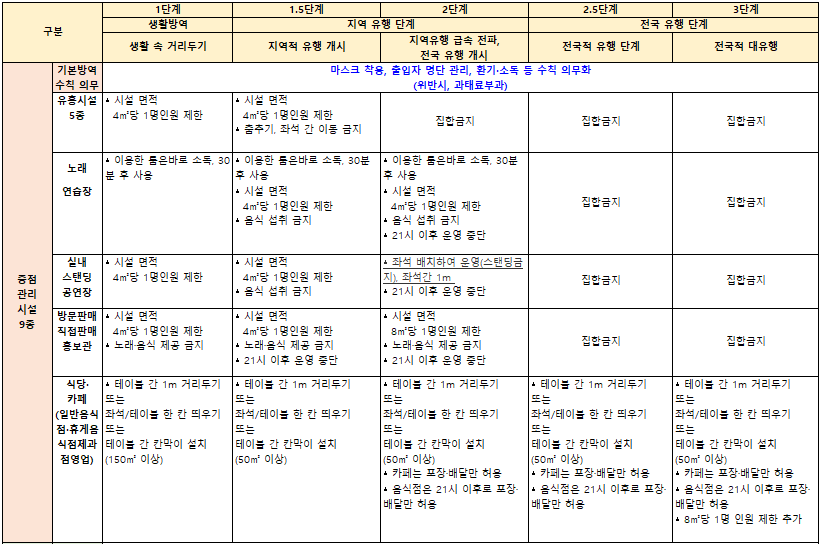 2. 사회적 거리두기 단계별 시설 관리 기준(중점관리시설)