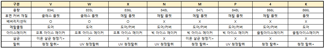이렇게 표로 보면 뭔가 엄청 복잡해 보이지만,사실 차이점은베버리지 센터가 있는지 없는지,후면 커버 재질이 글래스인지, 메탈인지, 사출물인지아이스 메이커 종류가 무엇인지살균/탈취는 어떤게 적용되어 있는지 정도 입니다.